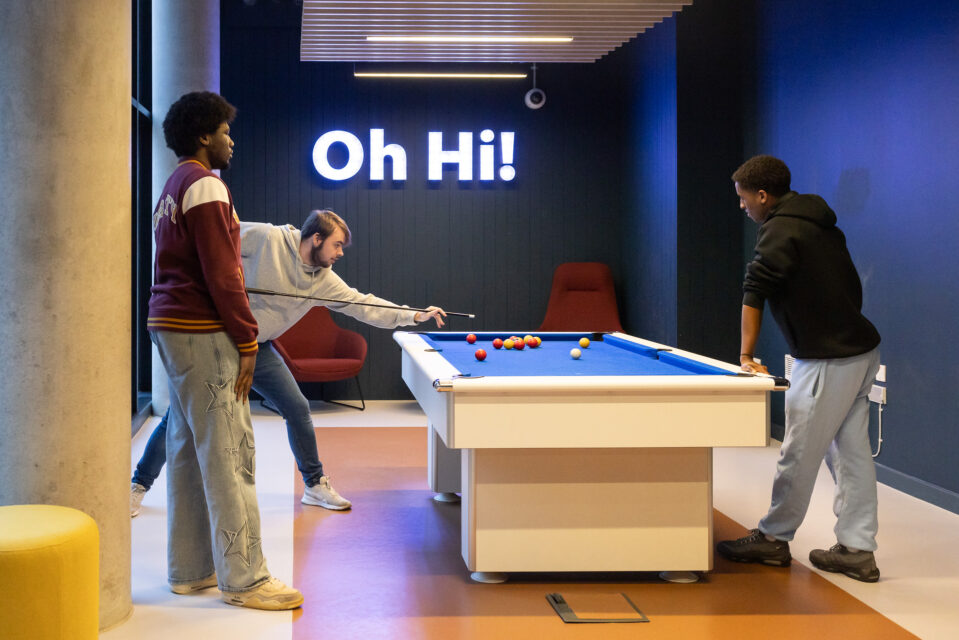 Large, open spaces provide an ideal arena for gaming sessions or society meet-ups, while smaller, quieter corners are perfect for catching up on reading or hunkering down to study. Across these spaces, the material palette cultivates a sense of belonging. Vivid reds and bright oranges reflect Bristol’s creative energy, balanced by gentler tones, warm timbers, and soft lighting.